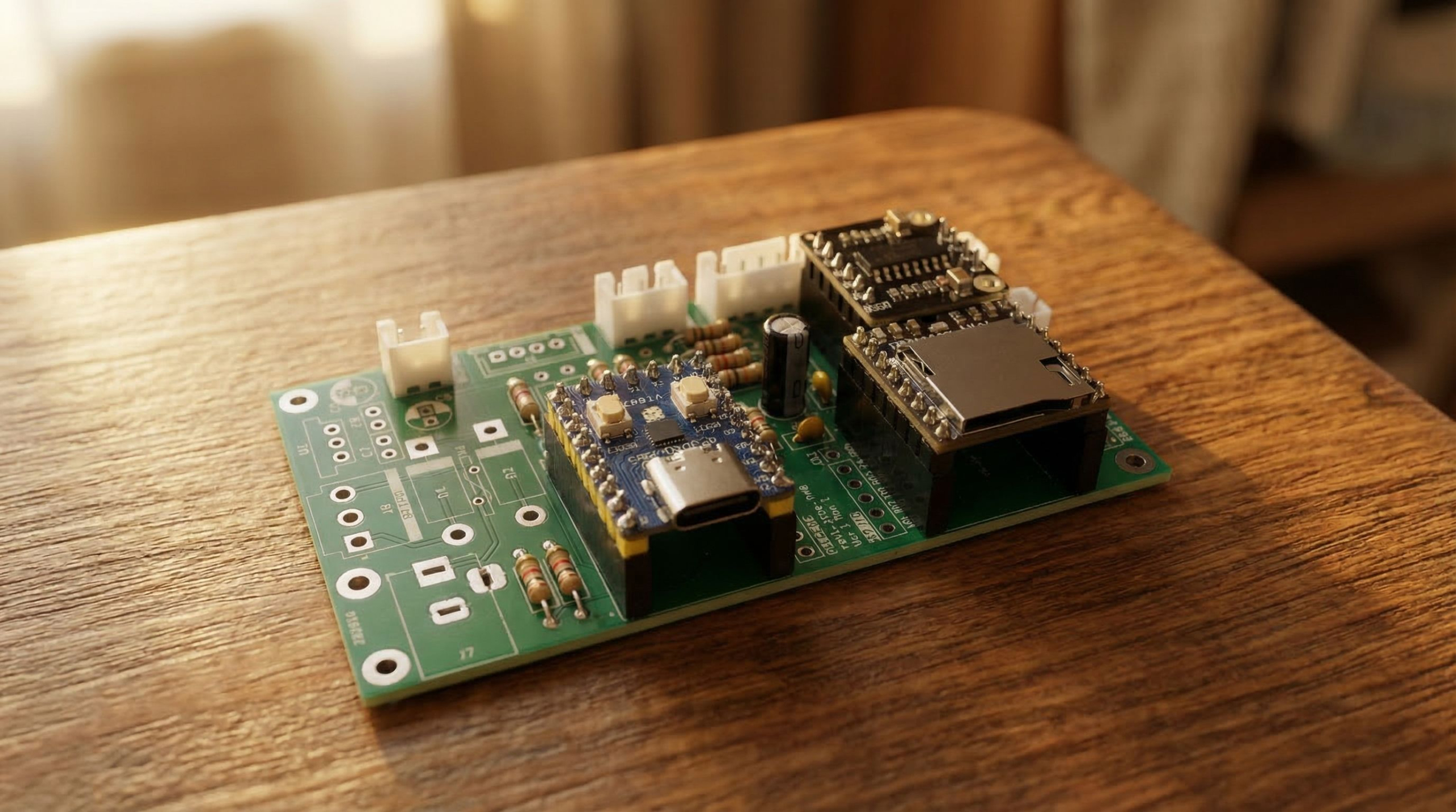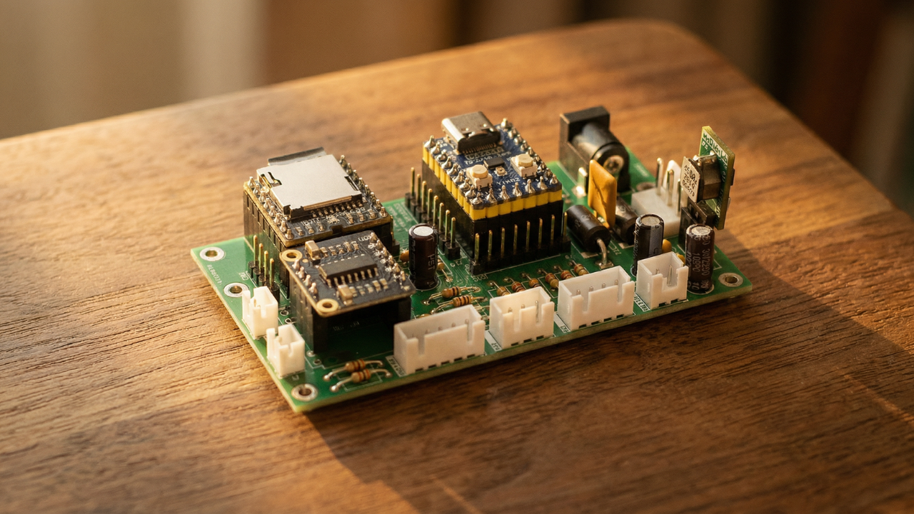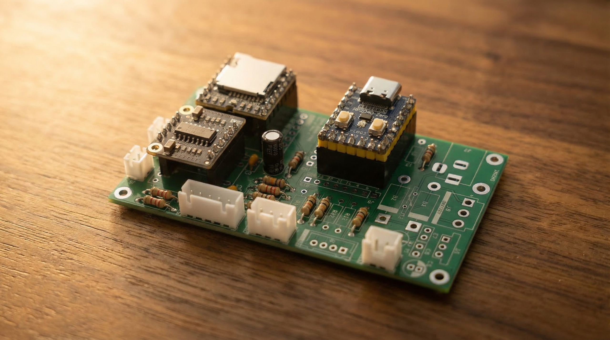 The PCB combines the amplifier circuit, audio routing, buttons, and power management into a single board. Instead of wiring each component individually, you simply solder the components into the board.