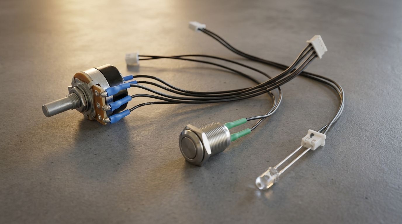 This section covers assembling the three wiring harnesses that connect the front controls to the radio’s circuit board. The harnesses include a rotary potentiometer for volume control, a stainless push button, and a clear LED indicator, each prewired with connectors that plug directly into the PCB. Follow the wiring layout to confirm each connector is oriented correctly and route the wires so they fit cleanly inside the radio housing during final assembly.